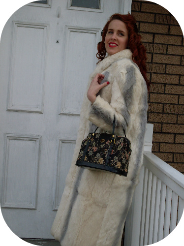 vintage fur coat, vintage dress, vintage hat, vintage handbag, faux fur bolero, belt {thrifted}